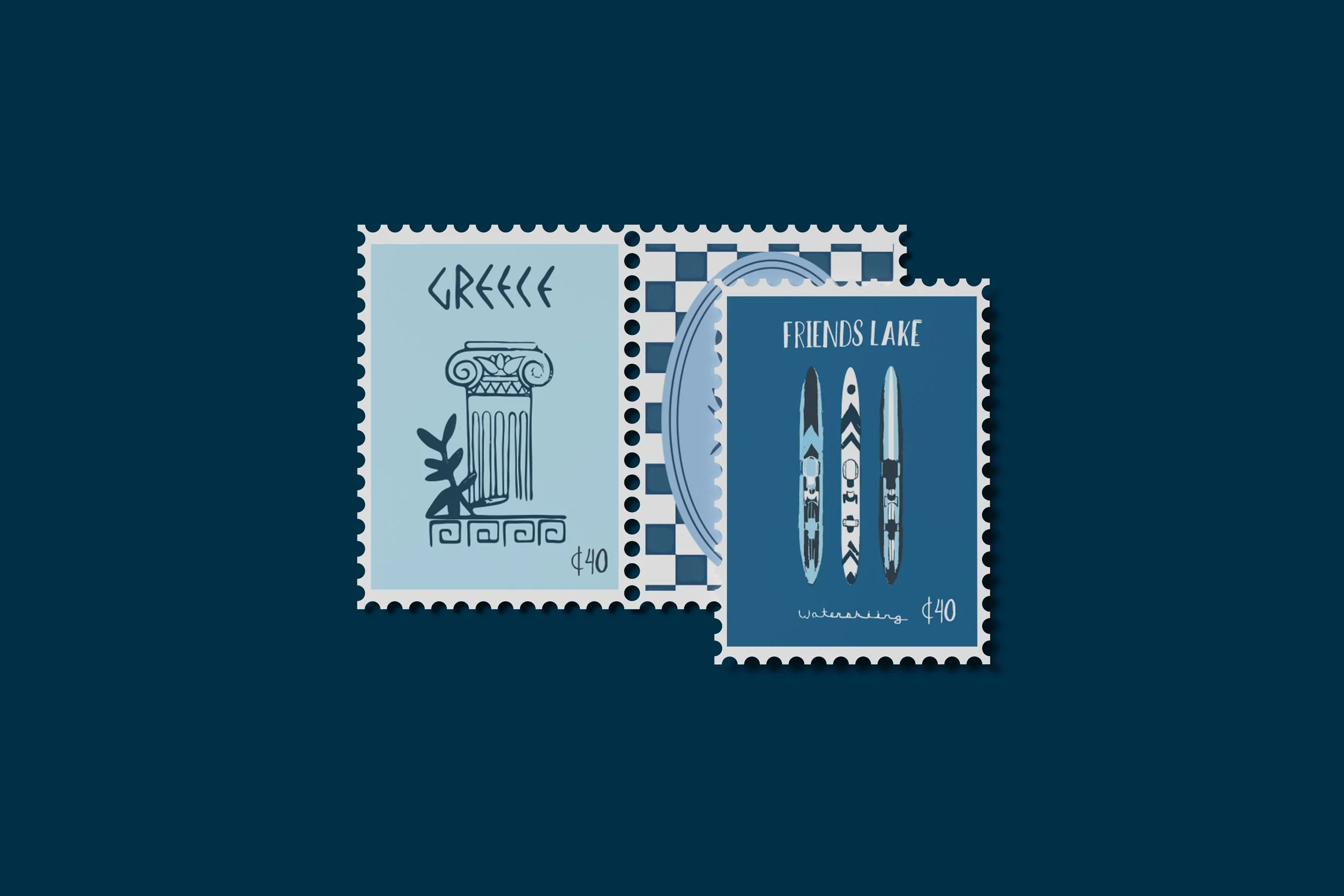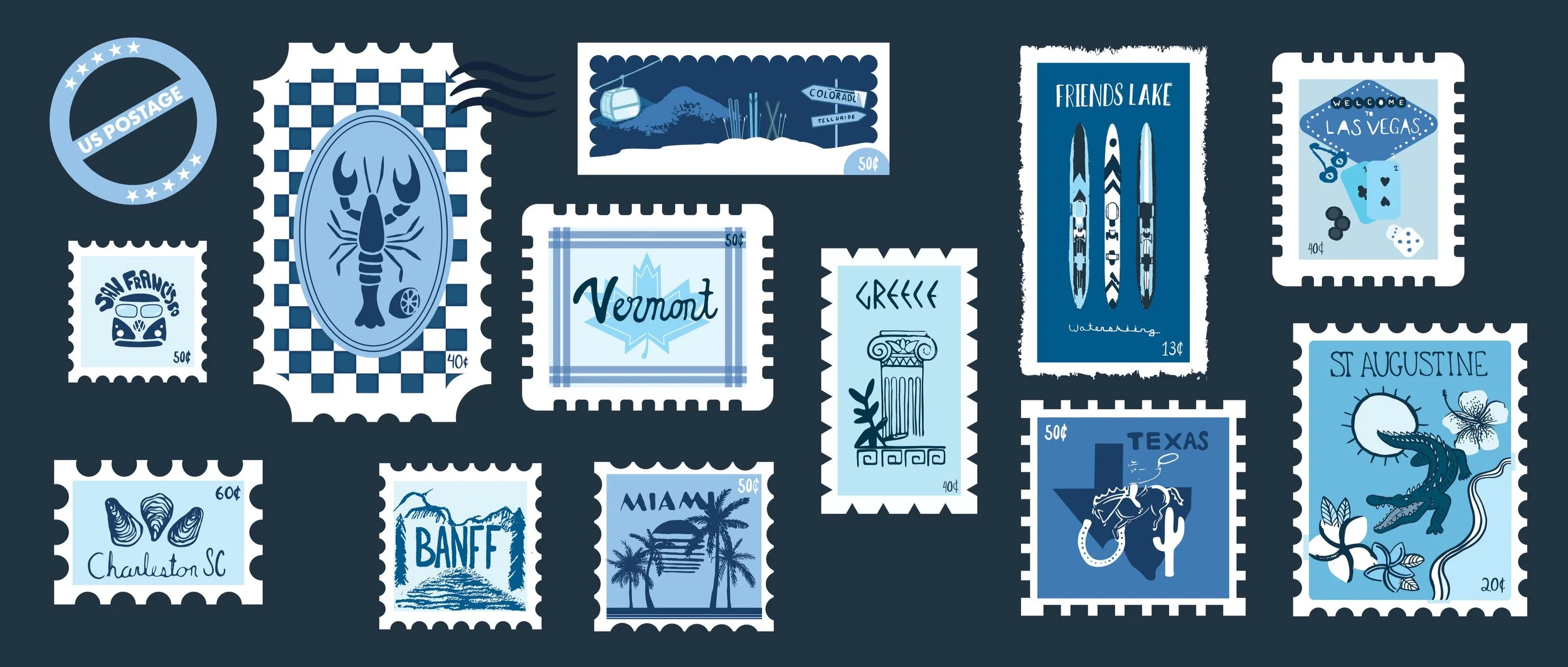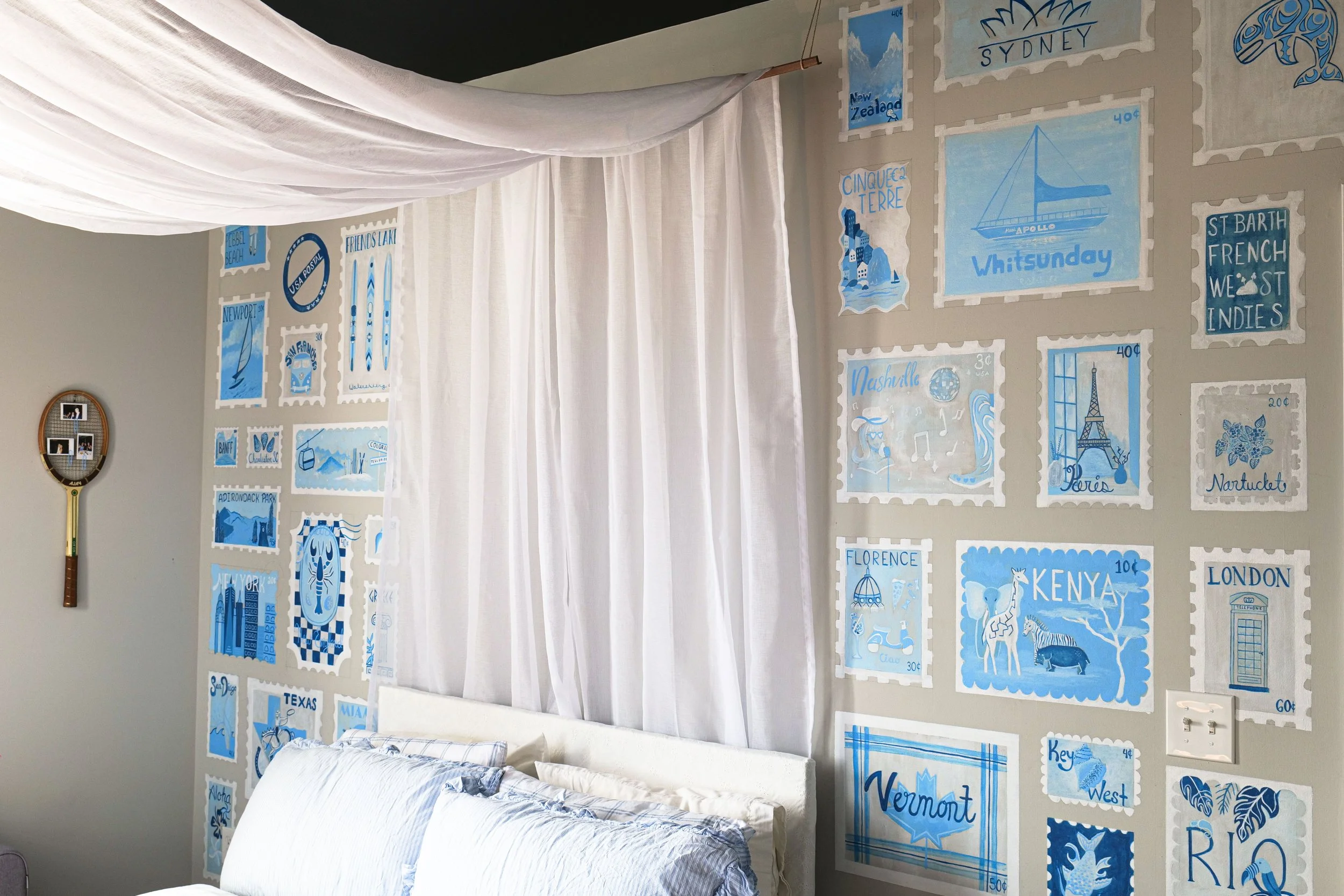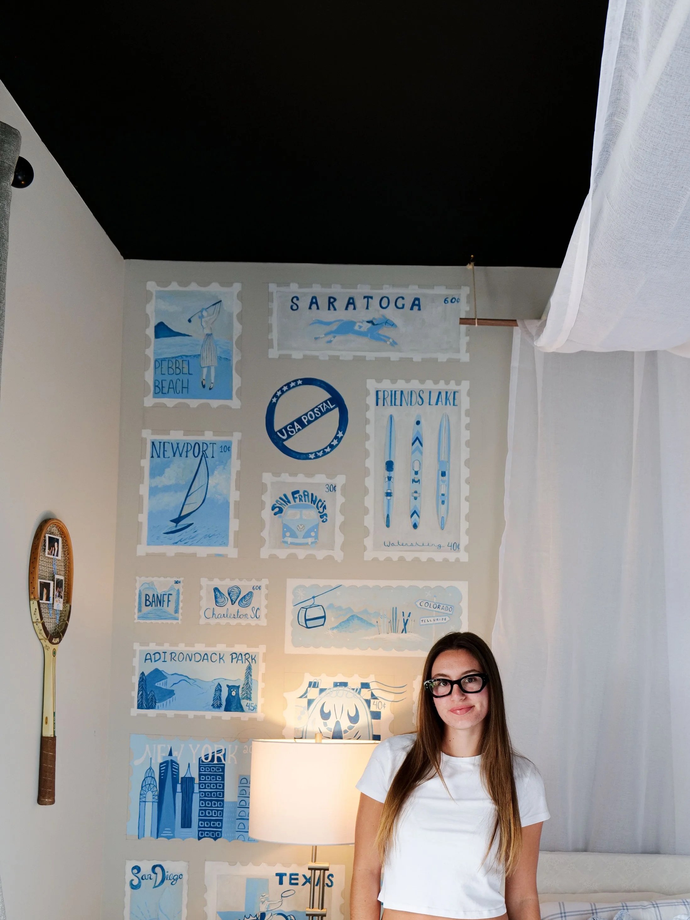 It all started with being home all summer long, in my very gray, very dark plain room. This room used to be a place that represented loneliness, and overthinking, until I changed that. It was time for a fresh start, out with the gray and in with over 50 postage stamps! Why postage stamps? Each stamp illustrated represents a travel destination, acting as a time capsule for unforgettable adventures, and a vision board of places that live on my bucket list. For each stamp design careful research was conducted to execute the overall aesthetic of the location, making sure the typography and imagery was fitting. The impact of the mural transformed the space, achieving a positive, sentimental, and inspiring motif. Life is too short to not travel the world, then I come back and have something to paint!